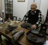 また、懇談のために案内された2階の「隠れ家」には、200万年前のアカシゾウ化石、縄文・弥生の土器、さらに「妙好人」(浄土教の信者)に関する文献など、幅広い知識を裏付ける品々が所狭しと並べられているのを拝見。