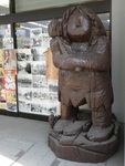 その後、元明石市議の山根金造さんがる大久保駅前で営まれている厳松堂書店を訪問。店の前には、山根さんが長年研究に力を注ぎ、「原人祭り」まで催されている明石原人の木彫像が飾られています。