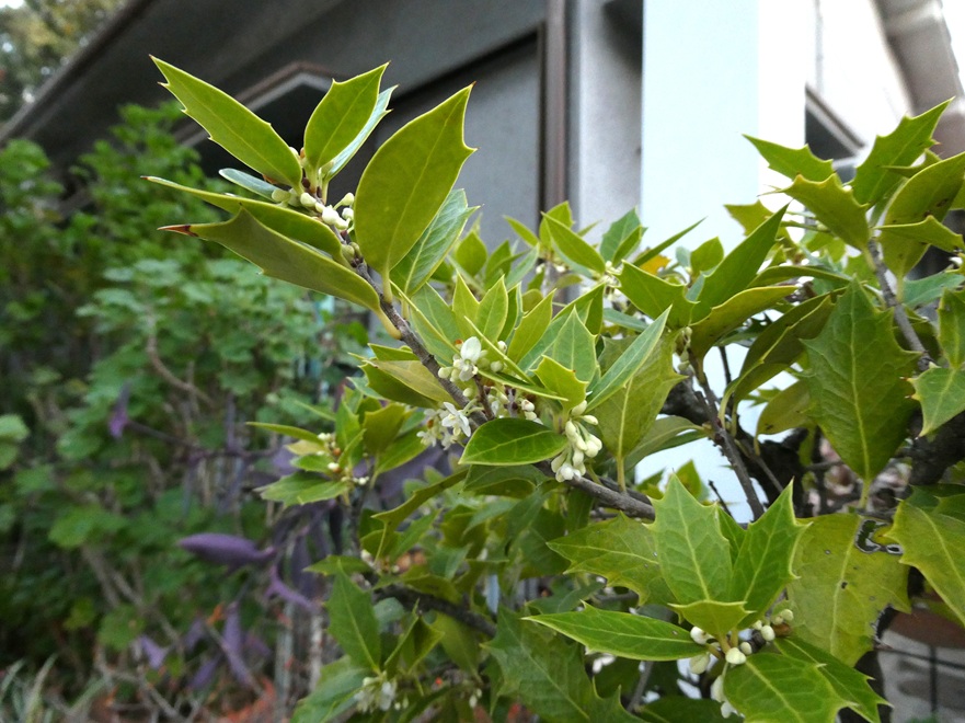 まだよく咲いてくれているのですが、季節を過ぎて見苦しくなった琉球アサガオとネットを撤去。近くに置いているヒイラギの花が芳香を放っていることに気づきました。