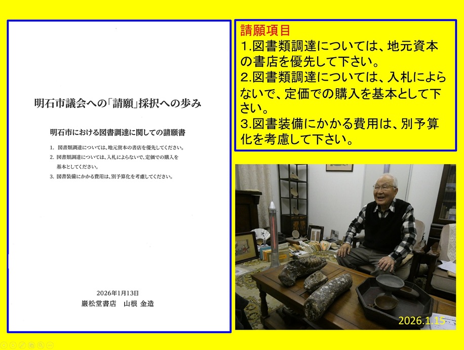 さらに、兵庫県明石市議会が、「図書類の調達に地元書店を優先して下さい」などの請願を採択したことも示したのですが、市当局はその事実を知りませんでした。