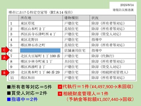今日の大綱質疑ではじめに取り上げたのは、あちこちからご相談を受けている空き家対策です。中でも、所有者が適切に管理せず、衛生面や安全面で問題があって「特定空屋」に指定された家屋が、堺市に14件あります。市の指導で7件は対応済み、継続指導中が2件、行政代執行での撤去と相続財産管理人制度を利用したケースが各1件です。紹介した事例ABCはこの「特定空家」でした。