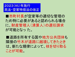 民法と空家特別措置法の改正で、2023年から堺市の権限で対処できるようになりました。ただ、財産管理人の選任請求をし、土地・建物を売却できる権限の行使は進んでいません。手続きが面倒な上、「特に必要」と裁判所に認めてもらえるかという不安が、現在対応している環境事業部や土木部をためらわせているようです。