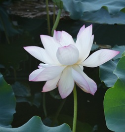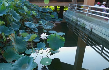 今夏咲いたくれた最後のハスの姿をカメラに収めるため、今朝も大泉池に向かいました。人々が集う中央休憩所からいちばん見える場所が最終開花になったのは、やや予想外でした。