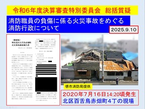 議論したのは、2020年7月に百舌鳥赤畑町の火事で消防活動に従事していた隊員の負傷事故です。同年12月に消防局まとめた「事故調査報告書」によると、火災家屋では一室の天井が崩落後も天井材質の異なる隣室は崩落を免れ、2人の隊員が活動中でした。しかし、同室の天井も突然崩れ落ち、一人の隊員が天井とその上の堆積物の下敷きになって重傷を負ったという事故発生の状況が詳細に記載されています。