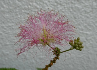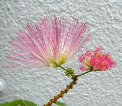 花数は少なくなりましたが、ネムの花が咲き続けています。塗り替えた外壁をバックに映えているので、レンズを向けました。咲き始めの16時46分の写真では、絹糸状の雄しべはまだねじれています。ほぼ1時間後の17時39分の写真(ストロボ使用)では、雄しべが段々まっすぐに伸びています。ちなみに、先端に付けている黄色い葯(やく)は花粉をつくる器官だそうです。