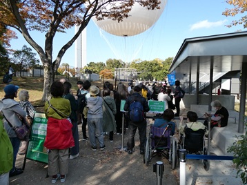 先月、「荒天のため」の張り紙で搭乗体験ができなかった気球に再挑戦するため、大仙公園へ。今回は運行状況を確かめて出かけたのですが、また振られました。11時ごろに到着した現場は、予約・当日とも、入口の前にすでに行列ができていました。運行開始も遅れており、テストフライトの後に3度ほど乗客を減らして運行したものの、上空が不安定なために仮係留して待機。15分後に再開されましたが、2度フライトして「運休」に。「10時前から約3時間並んで待った」という予約なしの母子はもとより、予約してやって来られた多くの方々も残念そうでした。