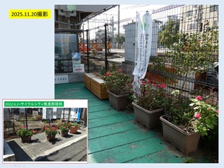 ところが、並べられたポットの植物は何の手入れもしないまま放置され、哀れな姿をさらしています。駅前に建設局が確保している250㎡の用地も、シェアサイクルステーションとして使っているものの荒れ放題。見苦しい限りです。
