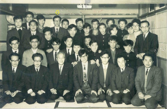 その際に話題になった写真は、2011年の市議選出発式の際、激励に来て下さった森さんが持参されたもの。森さんの卒業を前にした「追い出しコンパ」で、前列中央の森さんの隣には末川博総長の姿があります。ちなみに、後列の矢印がまだ1回生だった私です。
