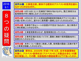 こんな情けない事態を踏まえての「認識」を問うた市長は、「危機感を持って対策を強化」し、「庁内ルールを見直し、全職員が強い意識で臨む」、「アスベスト対策形骸化させず、全庁的に知識・認識の周知徹底を図る」などと表明しました。